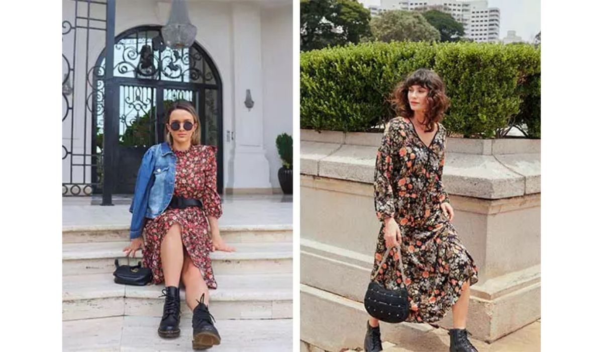 Essa é a dupla perfeita entre o romântico e o rebelde. A bota coturno quebra a delicadeza do vestido floral, criando um visual equilibrado e cheio de personalidade. Pode apostar!
